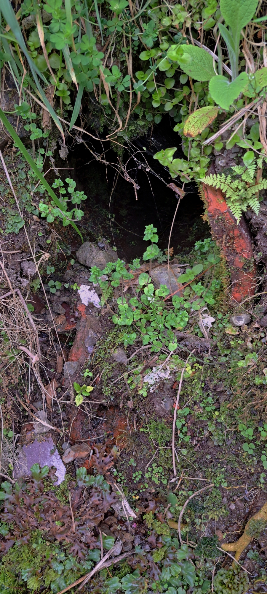 Protruding from the hillside below was an old pipe, possibly used as a scour pipe. As we prepared to leave, I noticed a sheet of iron partly buried in the ground. I managed to lift it upright for a photo, and while its purpose is unclear, it was likely part of the same structure.