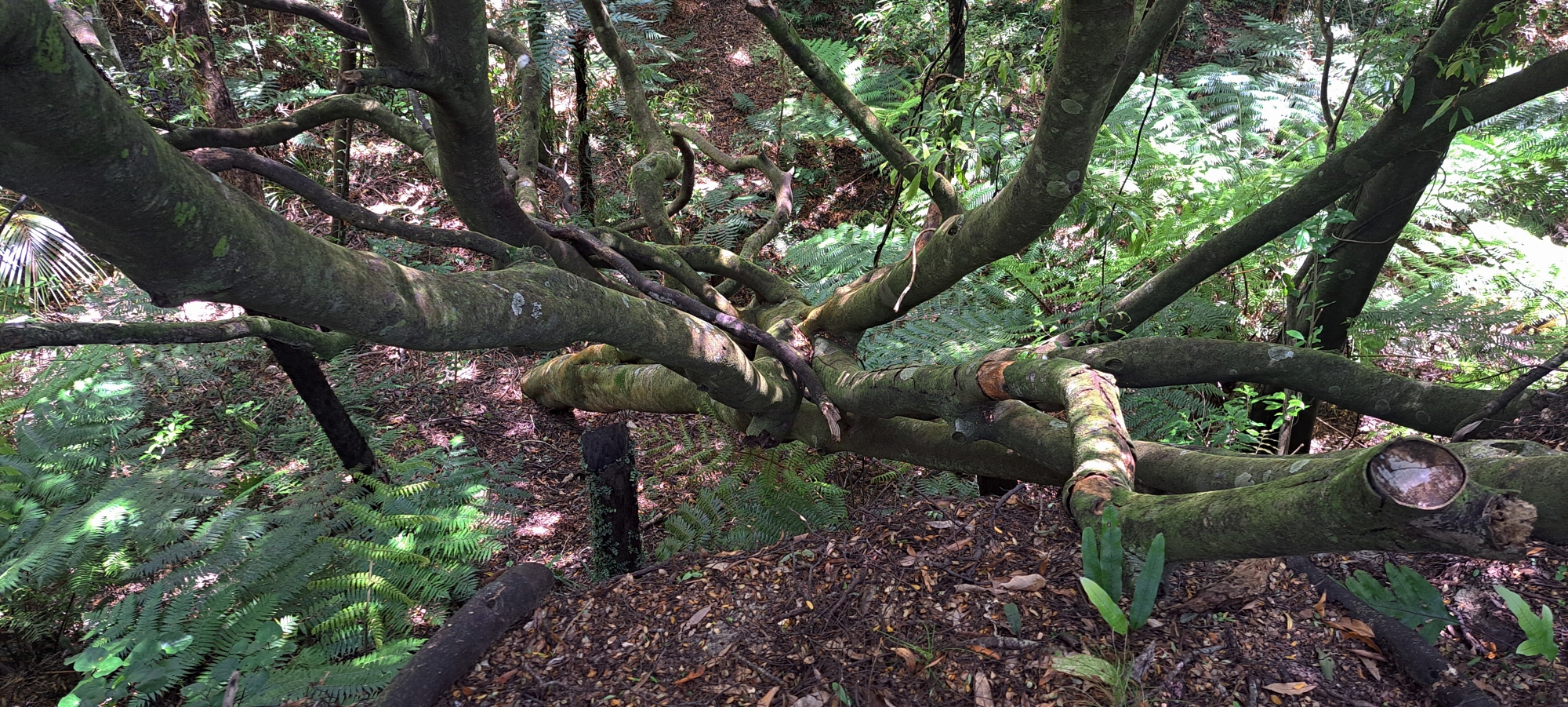 As I made my way toward Catchpool Valley, I noticed the same flat area of beech trees at the campsite and I sat on a bench seat to have lunch next to what looked like an old track. I wondered whether it might have been an old access track to the campsite. Shortly afterwards, a couple walked past and, a little later, I confirmed that it was actually the Five Mile Loop Track. After lunch I decided to follow it to become more familiar with the area and to identify potential routes for future bush bashes. The track was very pleasant, and I stopped frequently to photograph the native bush and the creek below.