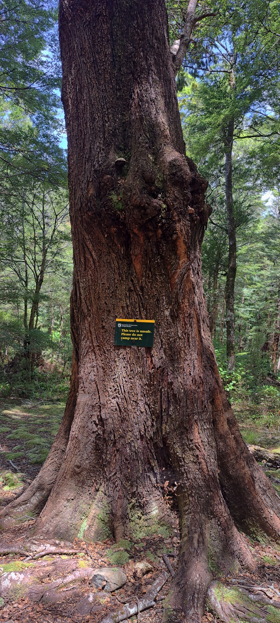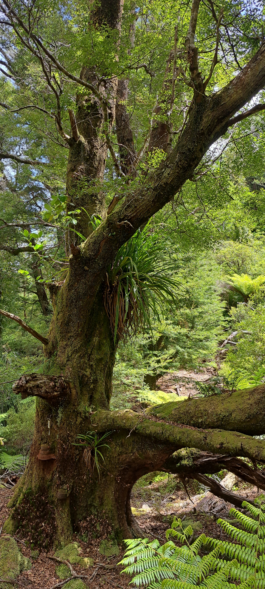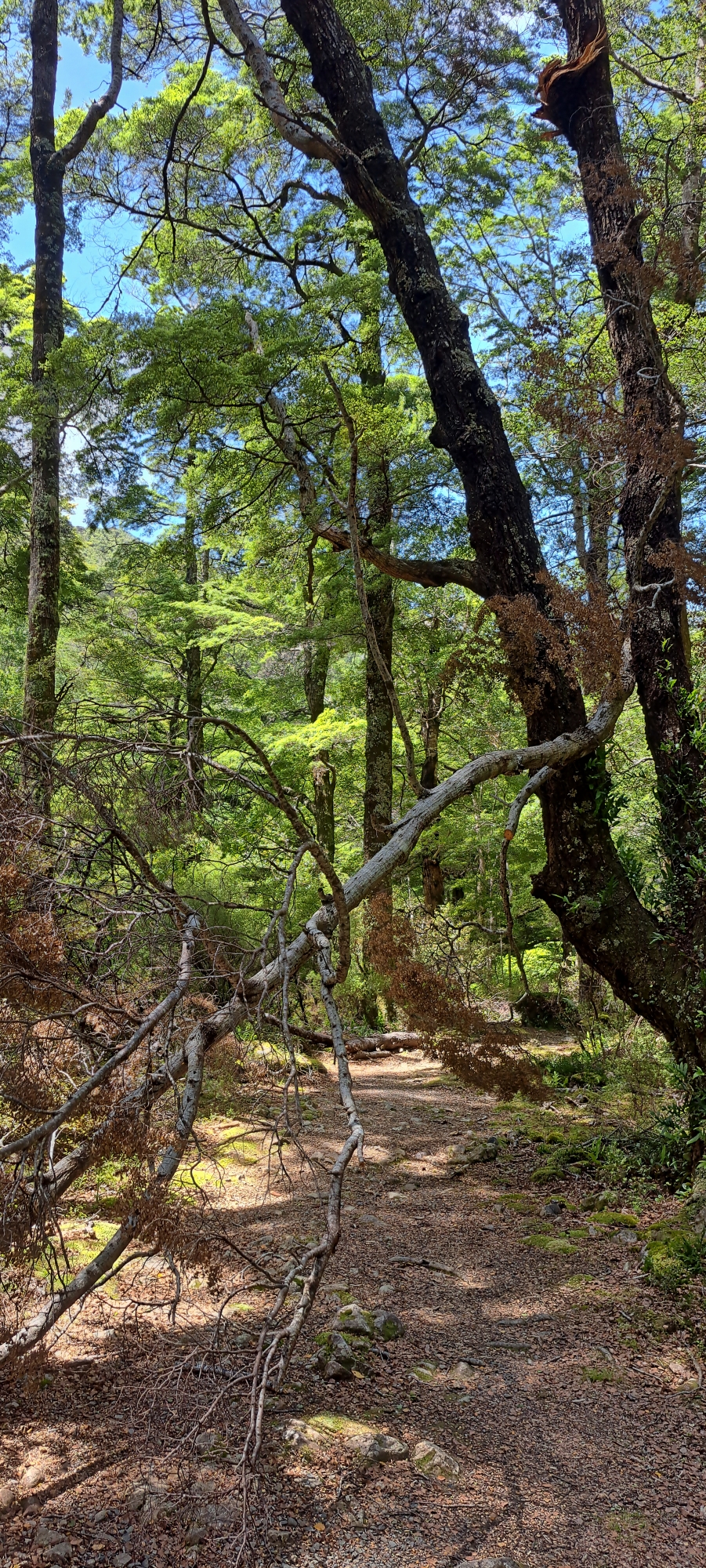 After crossing a bridge, I followed the Five Mile Loop Track. Some distance in, I decided to descend a hillside that appeared easier to navigate down than what I had encountered so far. This led me down to a lower plateau near Grace’s Stream. The stream itself featured several attractive smaller swimming holes. Continuing upstream alongside the river and further inland, I eventually reached a scenic plateau dotted with sparsely spaced beech trees. It was here that I realised I had arrived at what must have been Grace’s Stream Campsite. I took photographs of the area and noticed old signage proving that it was once a campsite. I then caught a glimpse of a bird that may have been a kākāriki, although it could also have been an Australian import. I tried to photograph it, but it disappeared just as quickly as it appeared.