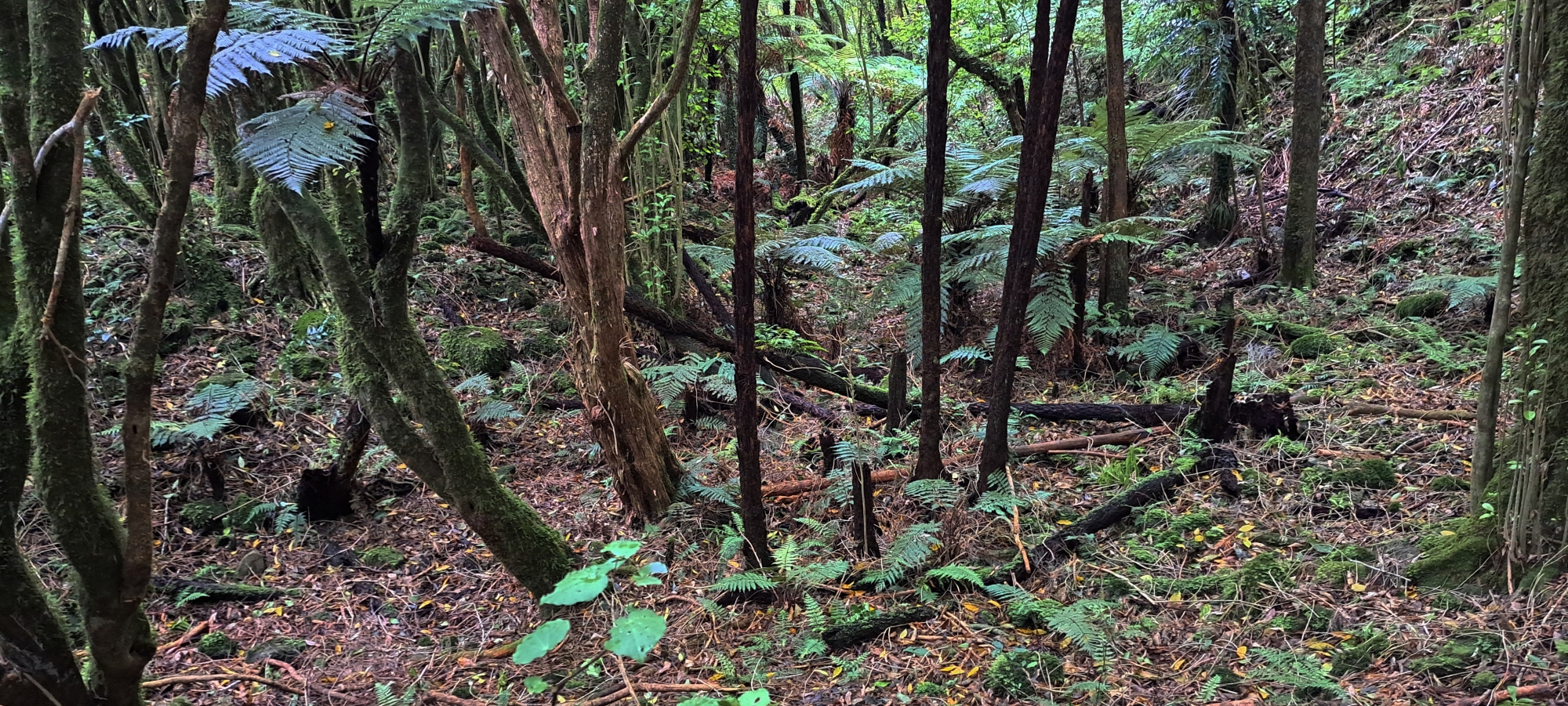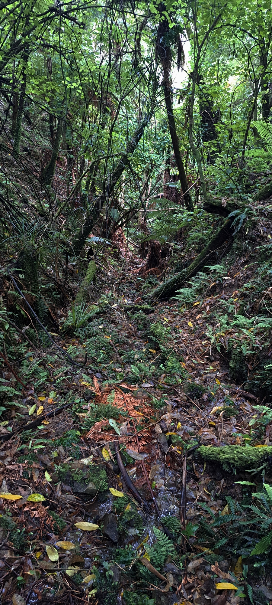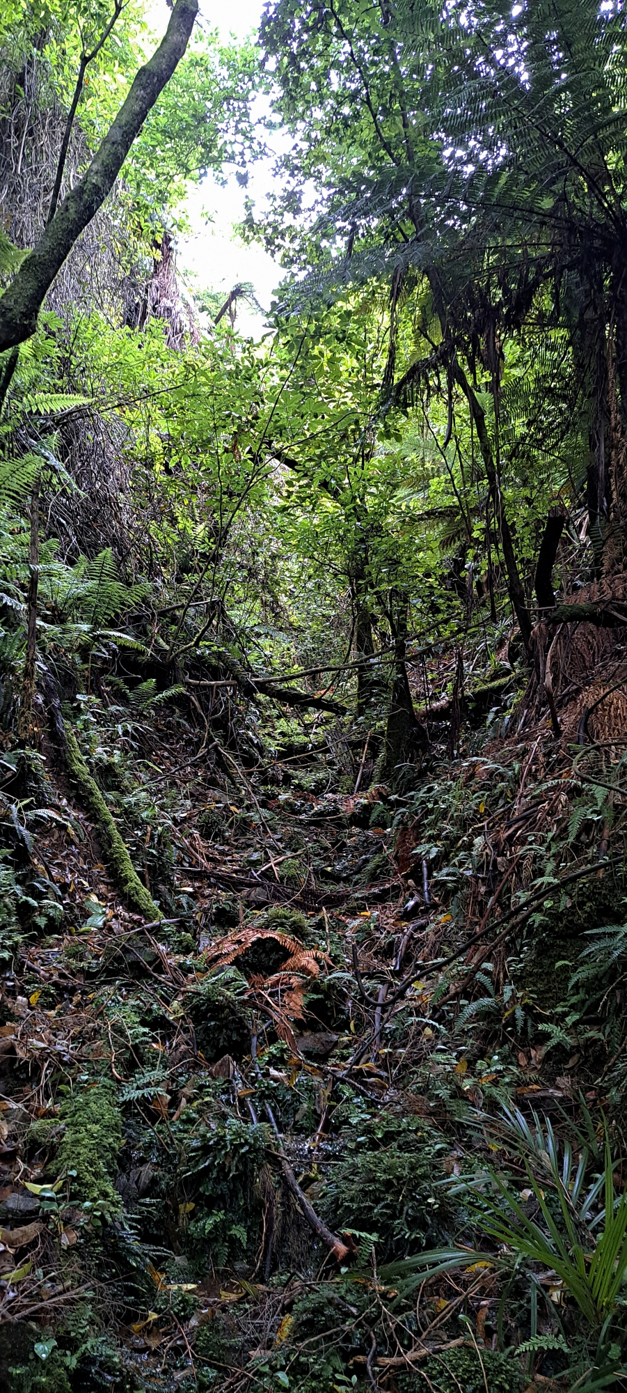 I began following the tributary and it quickly steepened, carving a narrow, confined gully. Several trees had fallen into and across the creek, creating a series of obstacles that required scrambling under, over, and around them. Before long, the creek became choked with dense supplejack. Rather than lose time forcing a route through it, I climbed out of the gully and began ascending the hillside where the vegetation was more sparsely spaced.