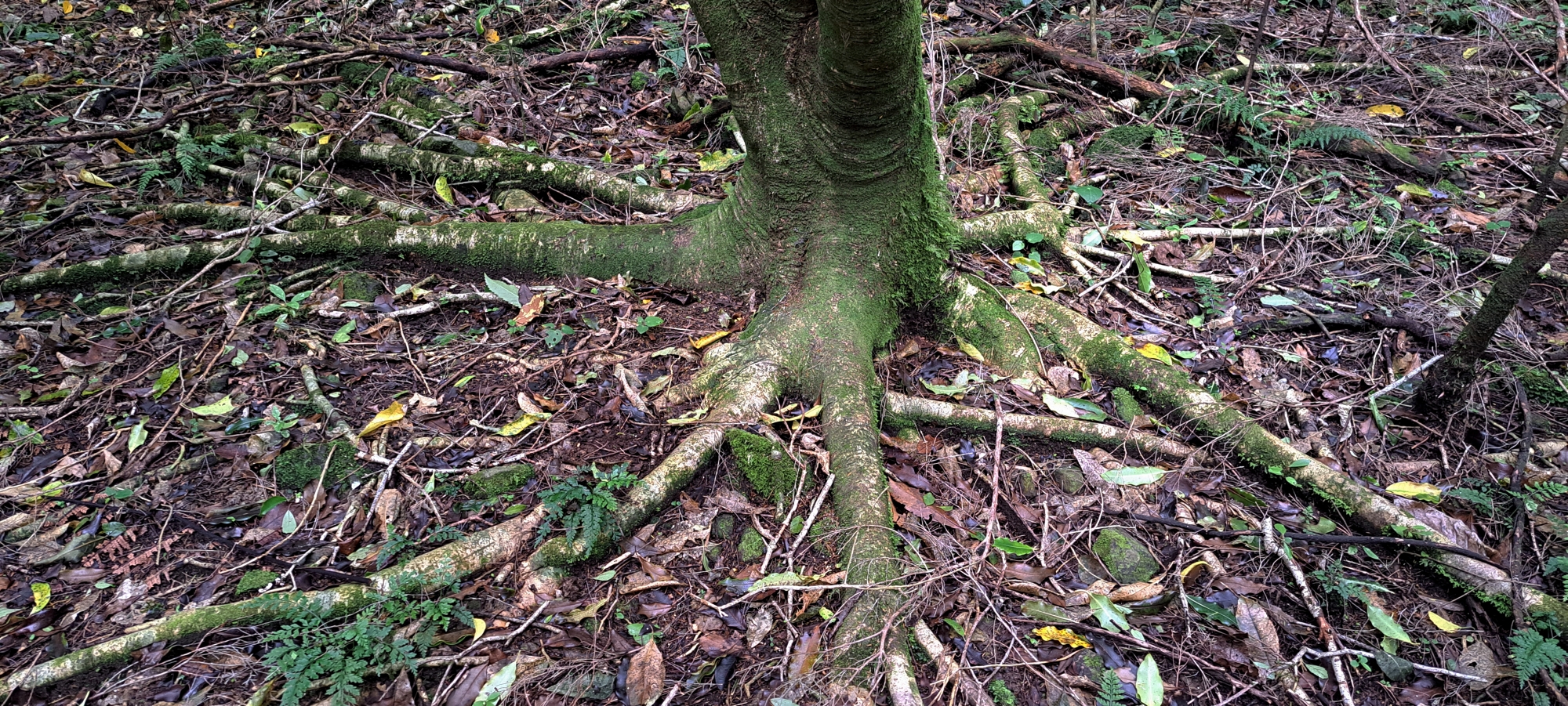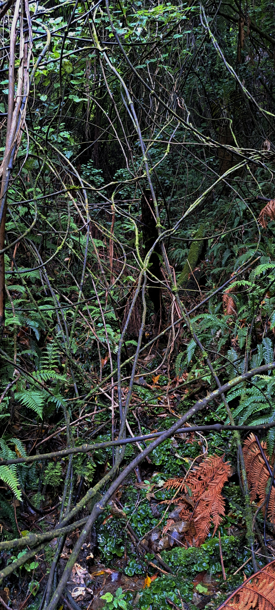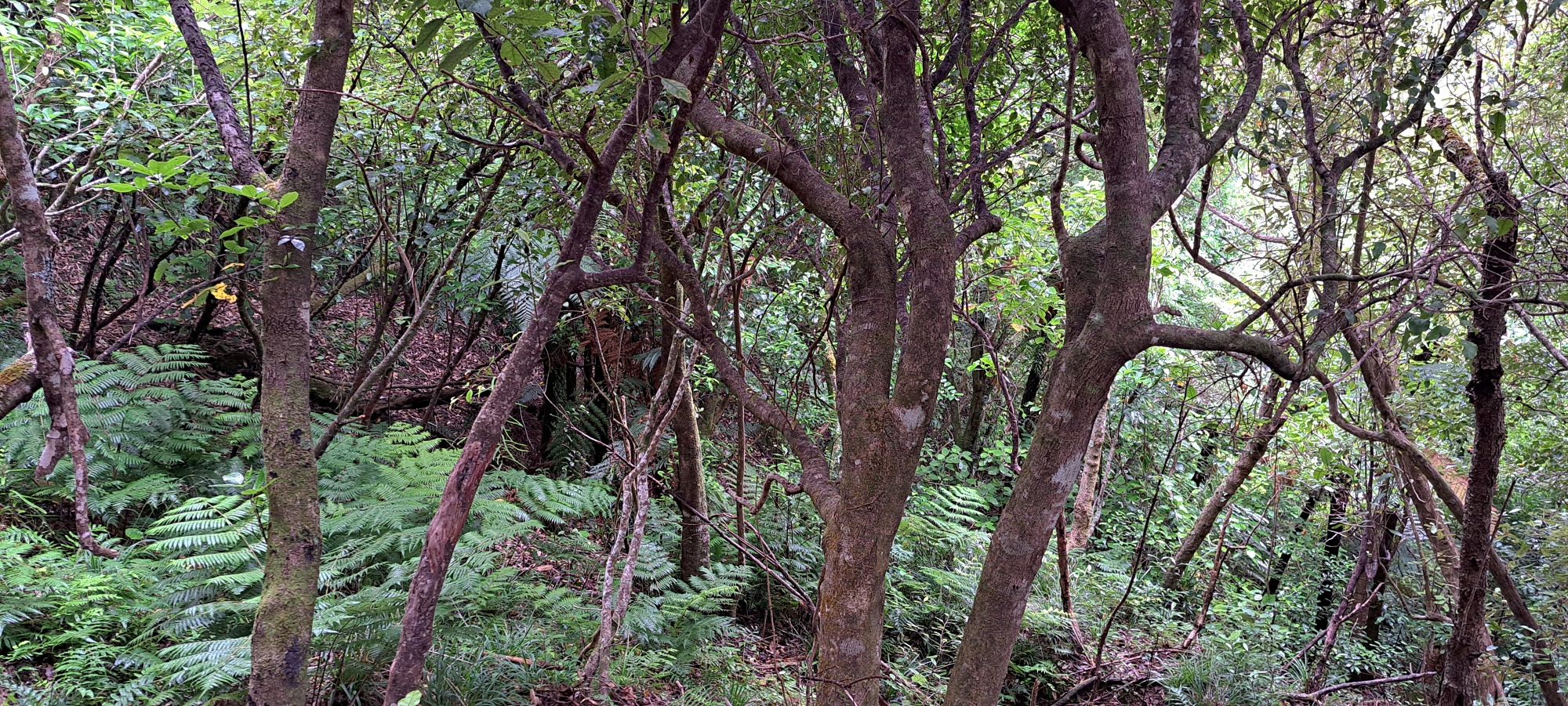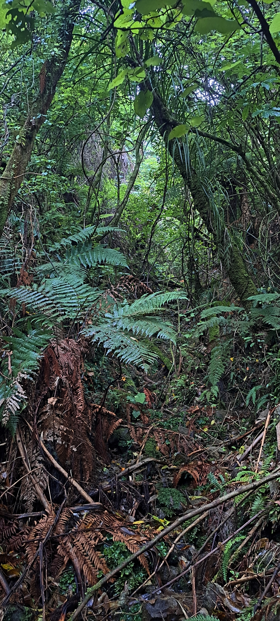 I began following the tributary and it quickly steepened, carving a narrow, confined gully. Several trees had fallen into and across the creek, creating a series of obstacles that required scrambling under, over, and around them. Before long, the creek became choked with dense supplejack. Rather than lose time forcing a route through it, I climbed out of the gully and began ascending the hillside where the vegetation was more sparsely spaced.