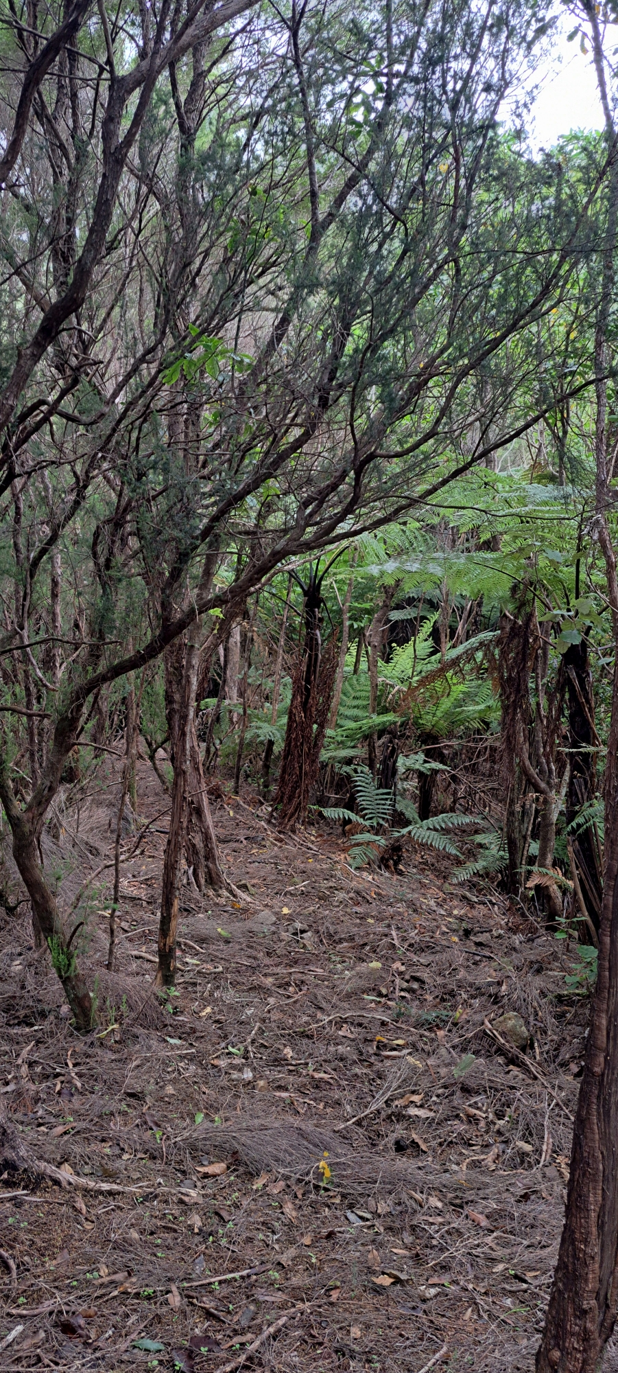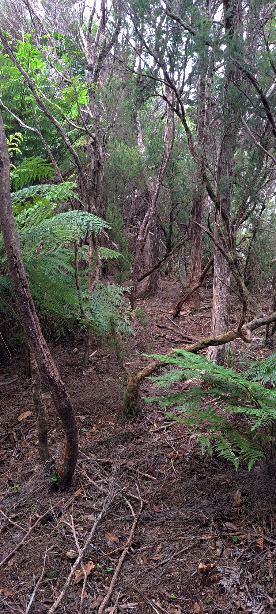 I followed this track further into the hills as it climbed along the ridgeline toward McKerrow Ridge. In time, I reached the head of the gully I had started from, but I continued along the ridge. Shortly after, the track faded away and the gradient steepened considerably. I doubted the track continued much further and decided not to push on through the scrub. Light rain had also set in, reinforcing the decision to turn back.