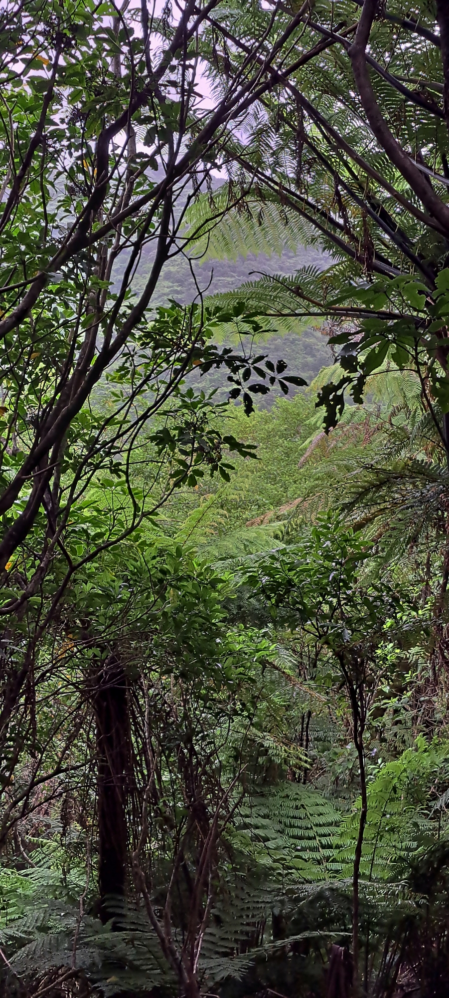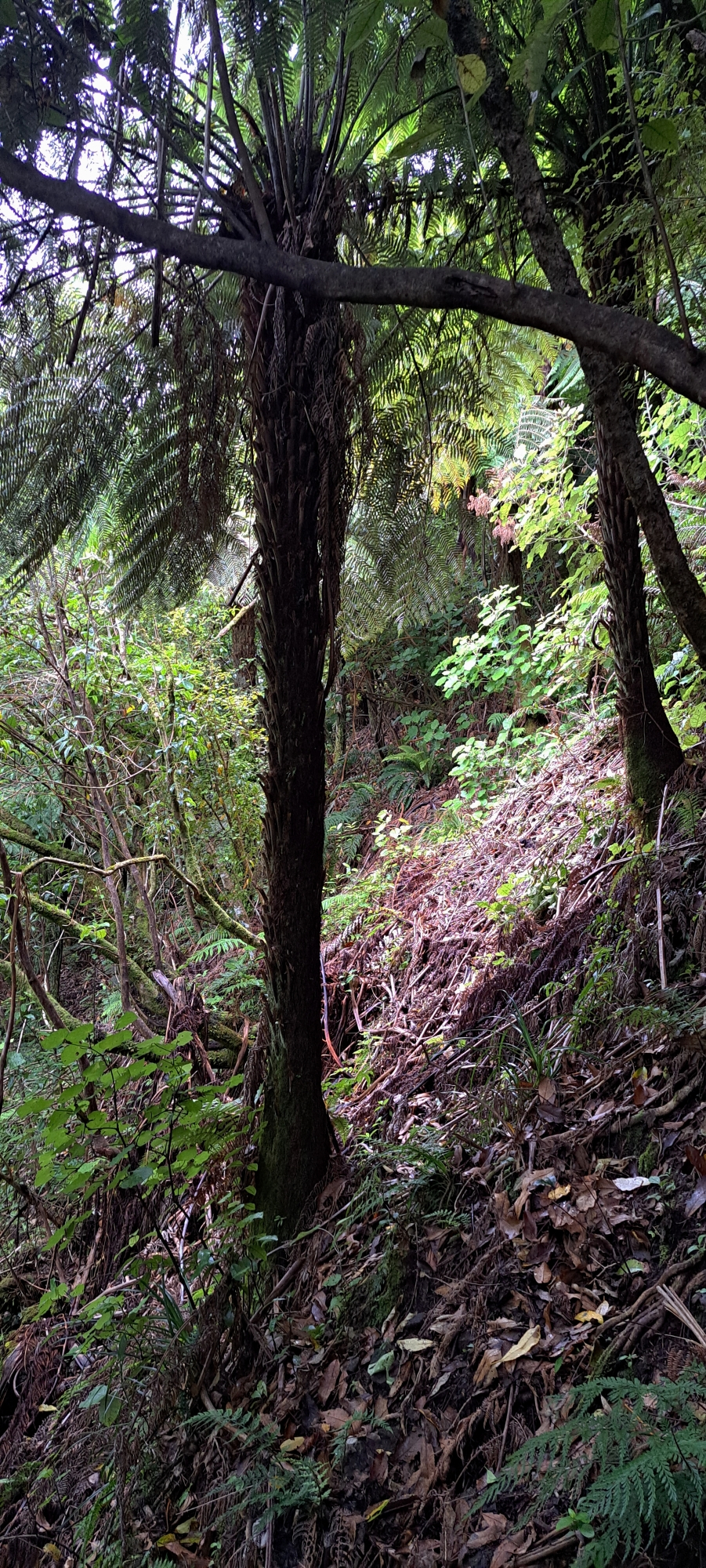 I kept an eye out for a potential lookout, knowing the views from this narrow ridge would likely be excellent. Reservoir Valley lay to the east, while Nikau Creek Gully stretched out to the west with Hine Road and beyond. Unfortunately, the forest canopy was too dense to offer unobscured views, so I settled for taking a few photographs within the bush as I made my way back down the steep hillside.