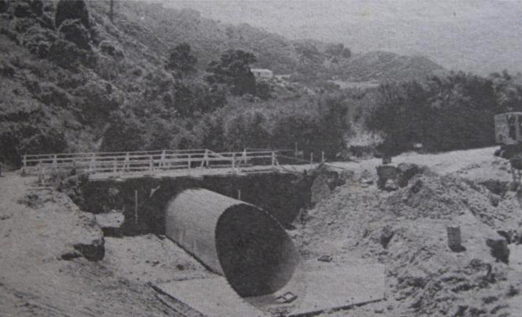 Moores Valley takes its name from George Moore, a Wellington merchant who owned land there in the nineteenth century. The original wooden bridge on Moores Valley Road was built in the 1860s and replaced in 1967 with a road laid over a large corrugated iron pipe. That structure failed during a major storm on 15 February 2004, when debris blocked the pipe and the road was washed out. A temporary bridge was installed within two days and remained in place until 2007, when twin concrete culverts were built by Riverside Construction Ltd. The current two lane bridge, with a footpath on the east side, is owned by Hutt City Council and is recorded in official documents as Heaths Bridge, likely named after Bryan Hargrave Heath, a long serving local farmer and county councillor.