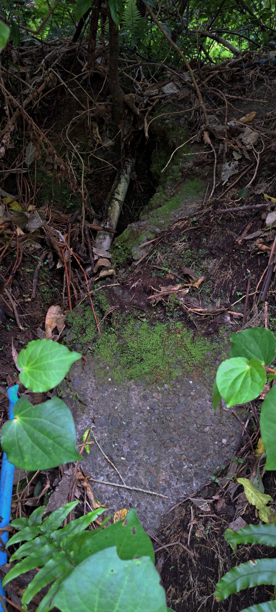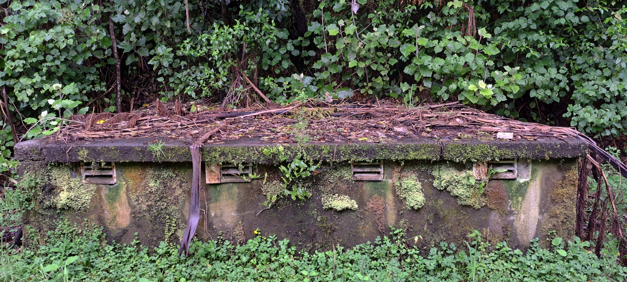 Today, O-K Pipe Venturi Meter House lies hidden on Maintenance Road, its outside concrete walls now carpeted with moss and surrounded by thick ground vegetation.