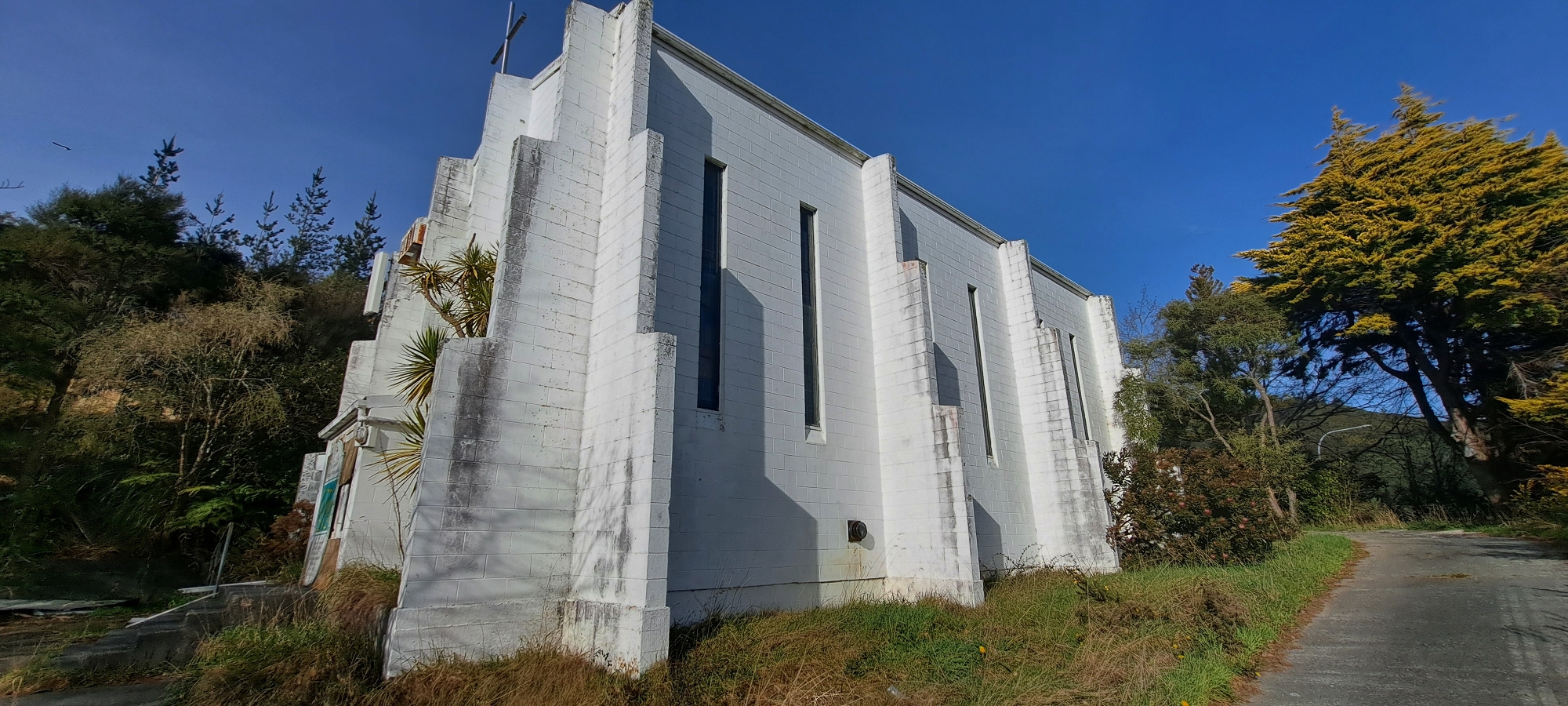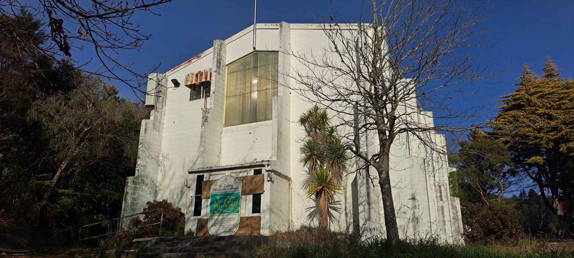 St John’s Anglican Church is located on Dick’s Hill, just behind The Village in Wainuiomata, at 119 Main Road. Although the building is now abandoned, it once served as an active place of worship. Among the reverends who served here were Mr Decandle and Ross Wards, the latter of whom also crafted the church’s leadlight windows.