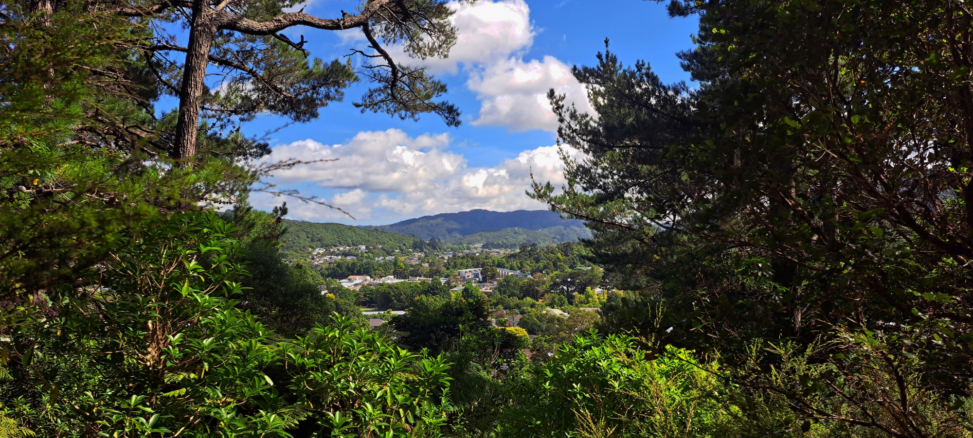 This view from the Harry Todd Track in the Harry Todd Recreation Reserve shows Hine Road in the foreground, with The Village and Pakura Place, immediately beyond. In the distance, the surrounding area of Main Road can also be seen.